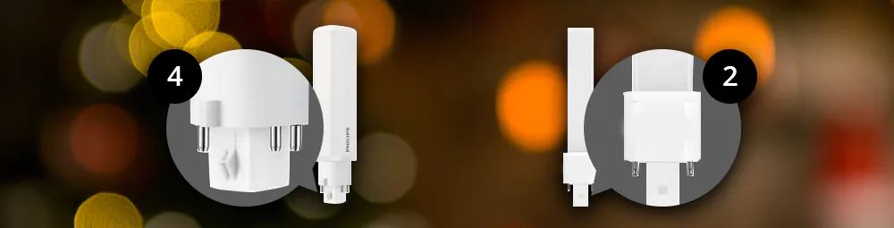 With (LED) energy-saving light bulbs there are fittings/lamp bases with 2 pins or 4 pins. Always choose a energy-saving bulb with the same cap/base, otherwise it will not fit in the fixture and will not work. Energy-saving bulbs with a 2-pin base work with a conventional ballast (EM) incl. starter. Energy-saving bulbs with a 4-pin socket work with an electronic ballast (HF) without a starter.