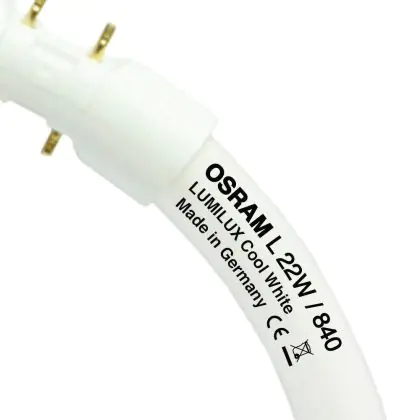 Osram T5 FC 22W/840 Circline Lumilux Cool White 2GX13 are fluorescent tubes circular shaped and have a 16 mm diameter. These lamps are designed primarily for decorative applications because they can create extra flat luminaires. These lamps should be used with electronic ballasts.With their 2GX13 base, Osram T5 FC 22W/840 Circline Lumilux Cool White 2GX13easily integrate into light fixtures.