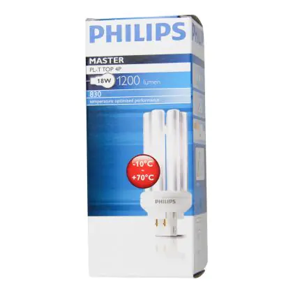 Philips PL-T TOP 18W 830 4P have a warm light of a colour temperature of 3000K. The colour rendering index is excellent, more than 80Ra. Philips PL-T TOP 18W 830 4P are very energy efficient: their energy label is classified A. Philips PL-T TOP 18W 830 4P lamps also have a very long lifespan, 13000 hours on average!